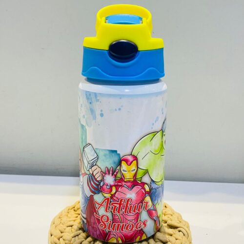 Garrafa Escolar Personalizada – Edição Super-Heróis (Nome Gravado)